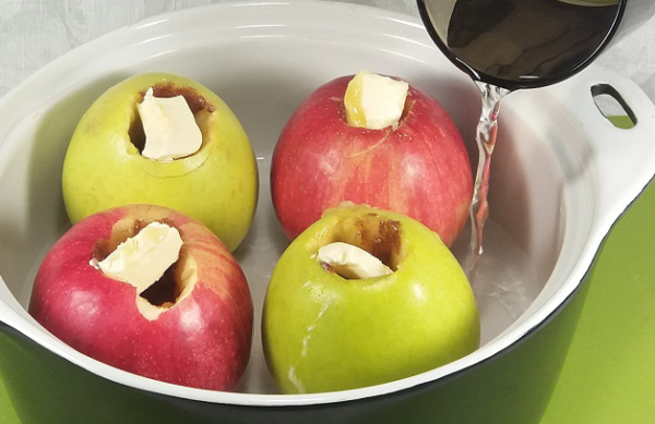 - Положить яблоки в небольшую форму для запекания и залить кипятком. Выпекать 35-40 минут или пока яблоки не станут мягкими.