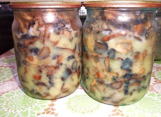 ΠΠ°ΠΏΠΎΠ»Π½Π΅Π½Π½ΡΠ΅ Π³ΡΠΈΠ±Π½ΡΠΌΠΈ Π·Π°Π³ΠΎΡΠΎΠ²ΠΊΠ°ΠΌΠΈ ΡΡΠ΅ΠΊΠ»ΡΠ½Π½ΡΠ΅ Π±Π°Π½ΠΊΠΈ Π·Π°ΠΊΡΡΠ²Π°ΡΡΡΡ ΠΏΡΠΎΡΡΠ΅ΡΠΈΠ»ΠΈΠ·ΠΎΠ²Π°Π½Π½ΡΠΌΠΈ ΠΌΠ΅ΡΠ°Π»Π»ΠΈΡΠ΅ΡΠΊΠΈΠΌΠΈ Π»ΠΈΠ±ΠΎ ΡΡΠ΅ΠΊΠ»ΡΠ½Π½ΡΠΌΠΈ ΠΊΡΡΡΠΊΠ°ΠΌΠΈ, ΡΡΠ°Π²ΡΡΡΡ Π² ΡΠΈΡΠΎΠΊΡΡ ΠΊΠ°ΡΡΡΡΠ»Ρ, Π΄Π½ΠΎ ΠΊΠΎΡΠΎΡΠΎΠΉ Π·Π°ΡΡΠ΅Π»Π΅Π½ΠΎ ΠΏΠΎΠ»ΠΎΡΠ΅Π½ΡΠ΅ΠΌ.