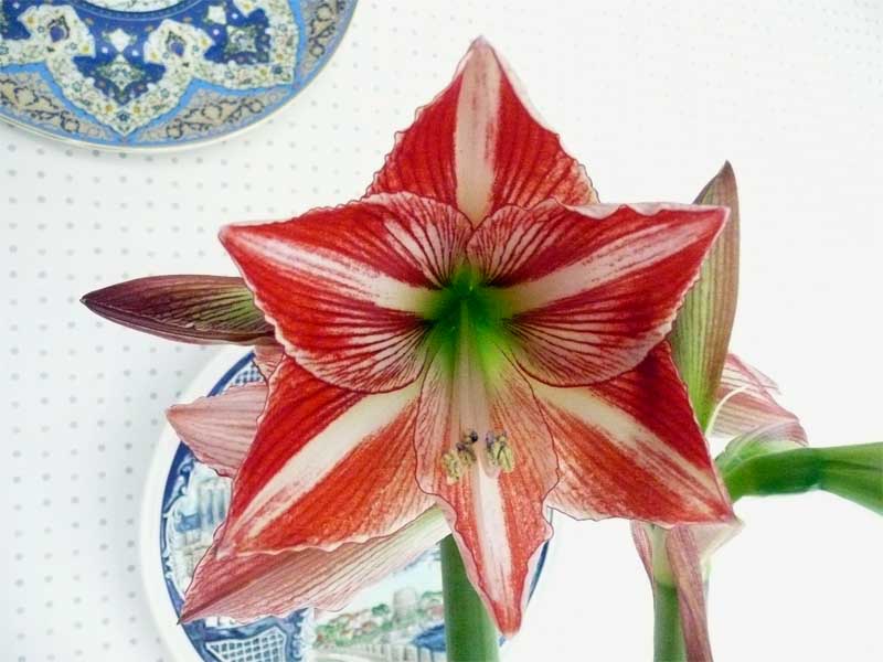 Гиппеаструм Харрисона – уроженец Уругвая, с великолепными белыми цветками, с проходящей по центру лепестка красной «вилкой». Требует постоянной влажности и холодного периода покоя.