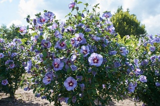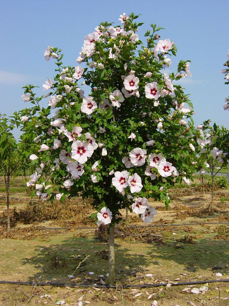 Гибискус сирийский, или сирийская роза (Hibiscus syriacus) — красивый листопадный кустарник высотой до 5-6 м. Отличается ярко-зелеными яйцевидными листьями до 10 см длиной. Цветы одиночные, мельче, чем у “китайской розы”, самой разной окраски от белой до малиновой, иногда двуцветные, простые и махровые, похоже на цветки мальвы. Выращивают гибискус в виде кустиков или небольших штамбовых деревцев. Цветет летом и в начале осени.