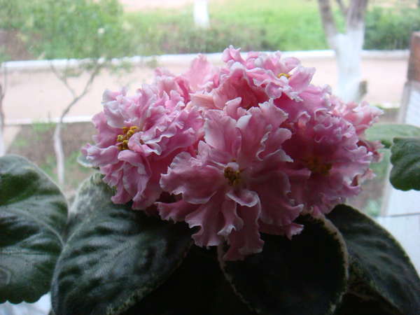 Окраска лепестков полностью гармонирует с названием сенполии: по основному тону лепестков розовой гаммы как будто кистью художника нанесены крупные размытые акварельные пятна цвета пыльной розы, занимающие весь центр лепестка, и своим появлением выделяющие белую серединку и белого же тона пышную кружевную оборку по контуру.