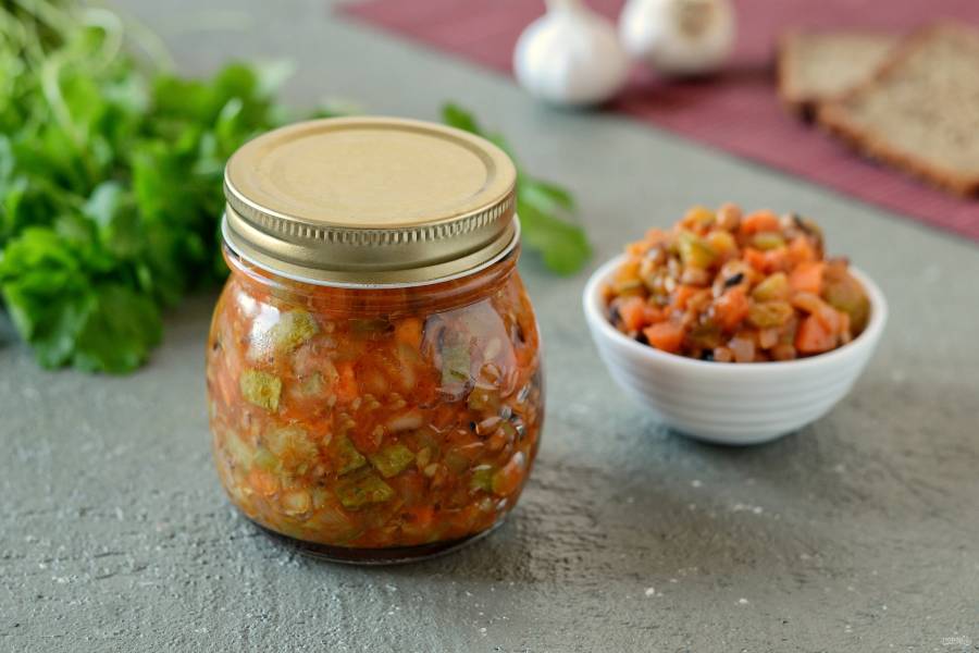 Раскладываем горячий салат по стерильным банкам, закатываем их крышками. Даем остыть банкам под «шубой» при комнатной температуре и убираем на хранение в прохладное место. Приятного аппетита!
