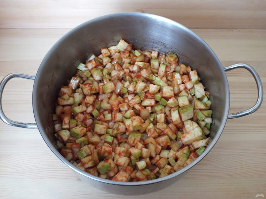 Осталось подготовить кабачки. Без шкурки и семечек должно получиться 3 кг. Режем мякоть на кубики. Все овощи высыпаем в кастрюлю с соусом. На минимальном огне увариваем овощную массу в течение 40 минут.