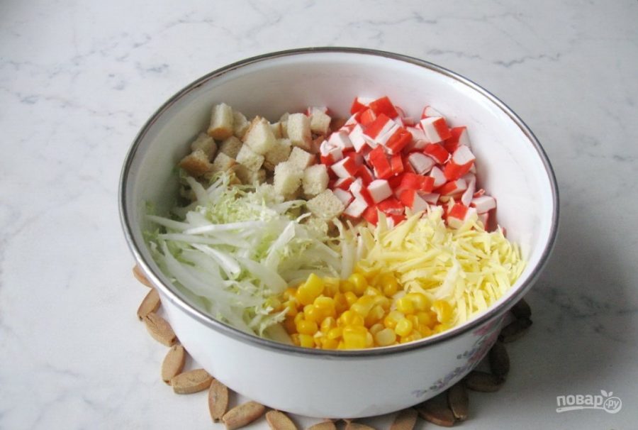 Салат с кукурузой и пекинской капустой и сухариками: Салат из пекинской капусты с сухариками, кукурузой и колбасой
