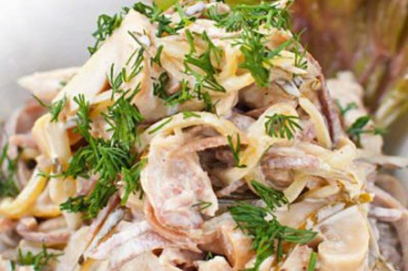 Салат с кальмарами и маринованными грибами обязательно понравится всем, кто любит этот морской продукт. Блюдо сытное и пикантное. Подойдет на праздничный стол. …далее