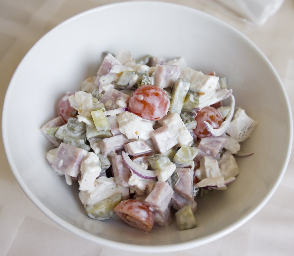 Салат с ветчиной маринованными грибами и маринованными огурцами: Рецепт салата с ветчиной и маринованными грибами