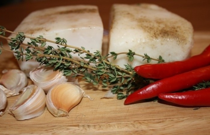 Сало для приготовления такой закуски должно быть мягким, нежным и, как ни странно, ничем не пахнуть. Ну, разве что шкурка чуть-чуть может отдавать запахом жженой соломы, с помощью которой обжигают свиную шкуру.