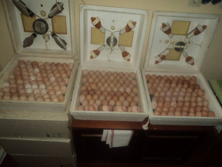 Примерно с 19-го по 21-й день с момента закладки яиц начнут появляться цыплята. Вылупившихся птенцов переносят в подходящую картонную коробку и сушат там с помощью электролампы мощностью 60—100 Вт при температуре около 30 °С. Количество вылупившихся цыплят составляет 40—70 процентов от закладки. Результат во многом зависит от качества яиц. Для проверки зародышей и контроля за их развитием желательно иметь овоскоп, пусть даже самодельный.