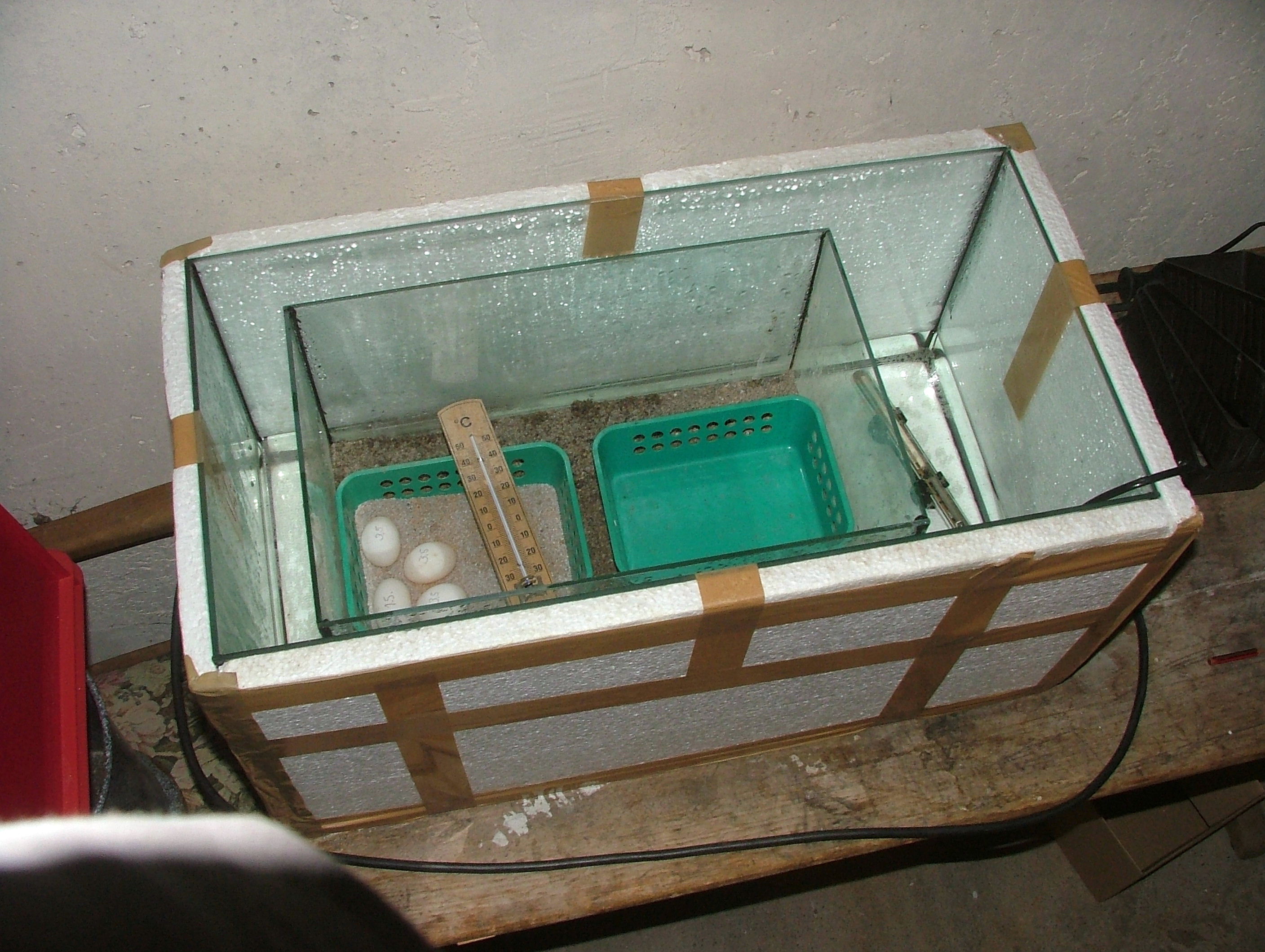 Самодельный инкубатор оснащается несложным оборудованием. Для этого на дноладываются три лаги — рейки 300x20x20 мм. Между ними посредине устанавливаются две емкости с водой для поддержания необходимого воздуха. В качестве емкостей подойдут пластмассовые крышки и корпуса от школьных пеналов, готовален, красок, лишь бы их борта не превышали 20 мм. Устанавливается и металлическая сетка размерами 300×300 мм с ячейками 5×5 мм. И, естественно, термометр. Он размещается горизонтально на сетке, в удобном для наблюдения месте.