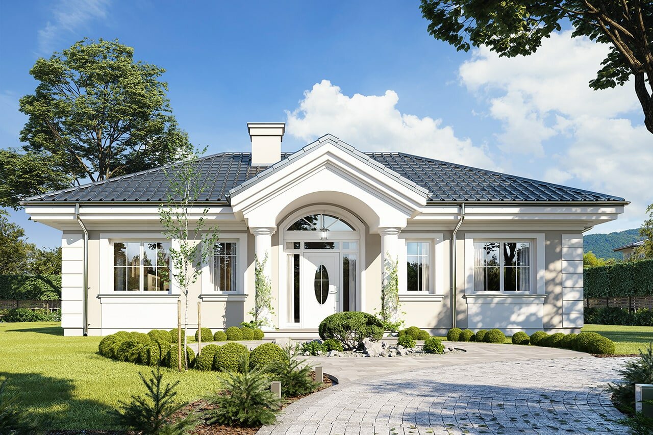 - Бюджетность, ведь тратиться на постройку второго-третьего этажа не придется. Это позволит не экономить на качестве строительных материалов и эффектном наружном оформлении здания. Согласитесь, внешняя привлекательность «дома вашей мечты» не менее важна, чем его практичность и долговечность. Изысканный фасад одноэтажного частного дома станет украшением территории и предметом вашей гордости.