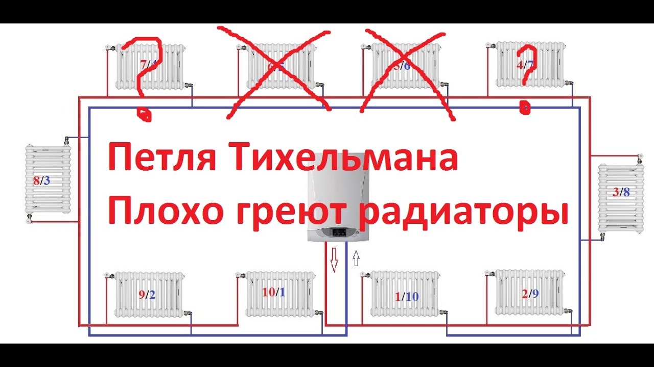 Петля Тихельмана принципиально отличается от классической тупиковой (встречной) схемы. При встречной системе трубопровода подающая магистраль начинается от котла и заканчивается последним радиатором, а «обратка» начинается от последнего радиатора и заканчивается котлом.