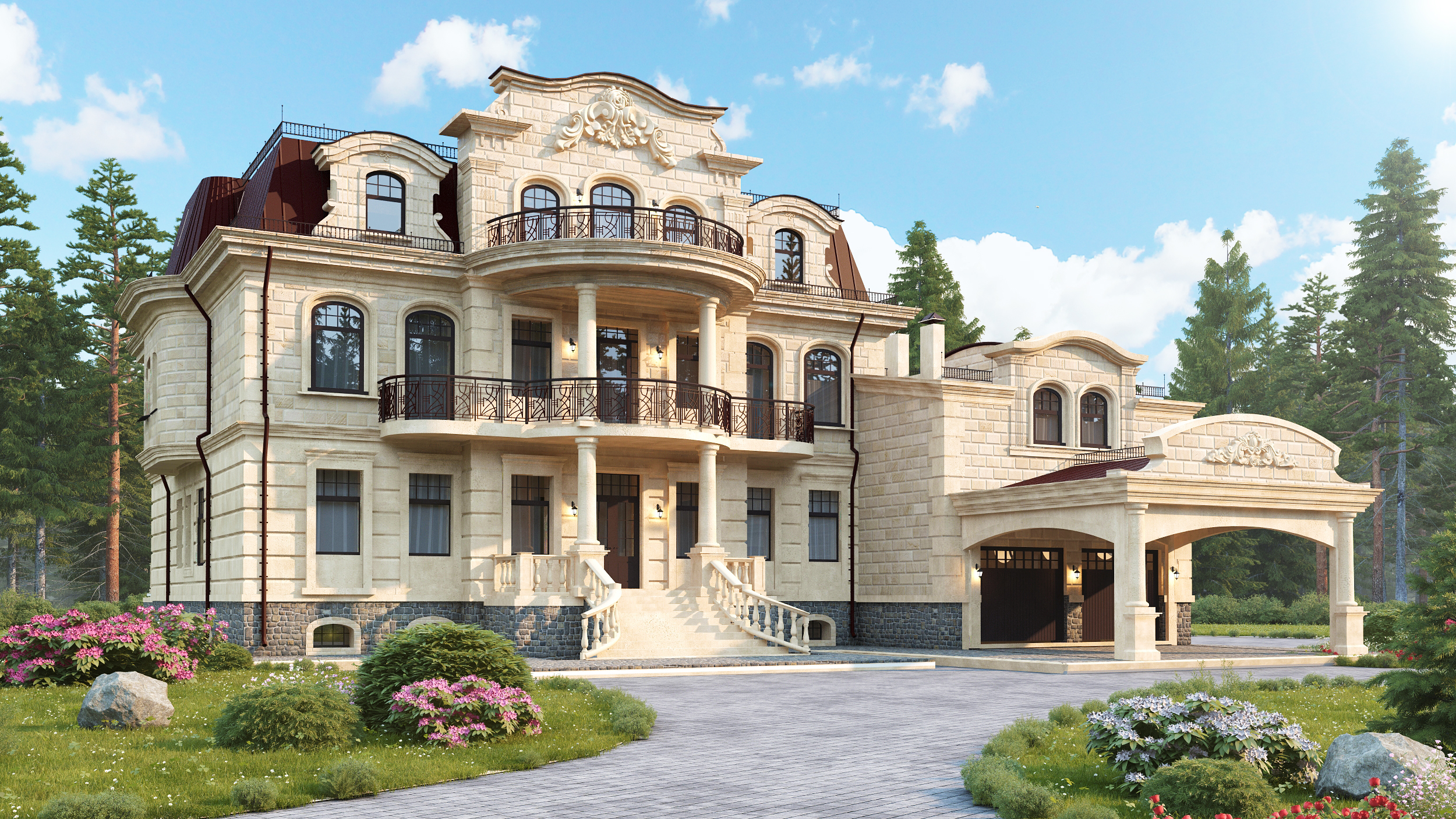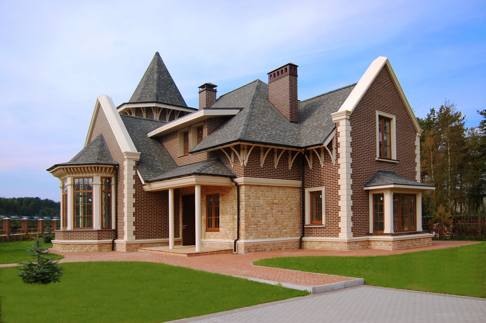 Роскошный кирпичный дом, обшитый декоративным камнем