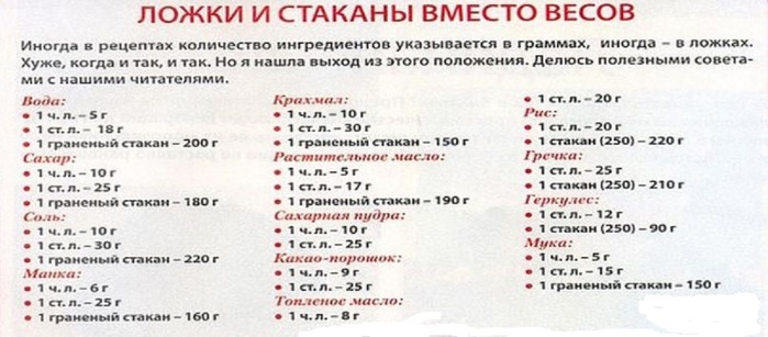 Приготовление блюд – это искусство, которое требует точности в пропорциях компонентов. Исходя из опыта, измерение объема продуктов можно проводить при помощи чайных, десертных, столовых ложек или стаканов. И тогда можно спокойно приготовить по новому рецепту пирог, пиццу или торт.
