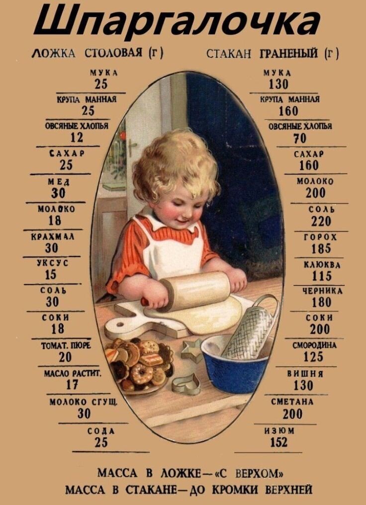 Важно помнить, что объем посуды не всегда равен весу продукта. Для примерных данных полезной может оказаться таблица мер и весов продуктов. В граммах многие сухие продукты весят гораздо меньше, чем их объем в миллилитрах.