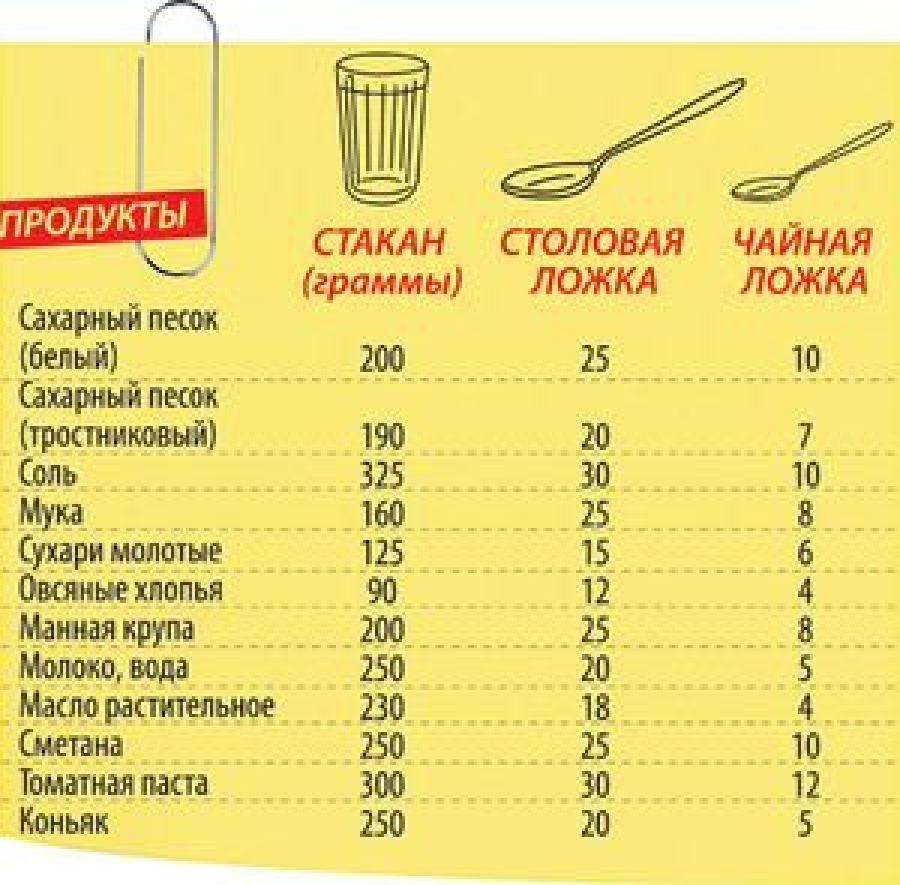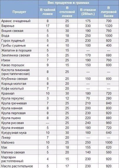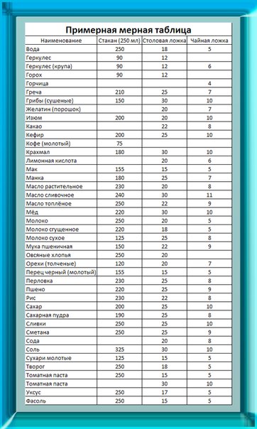 В таблице ниже показано, сколько мл или граммов весит стакан, в пересчете на различные ингредиенты.