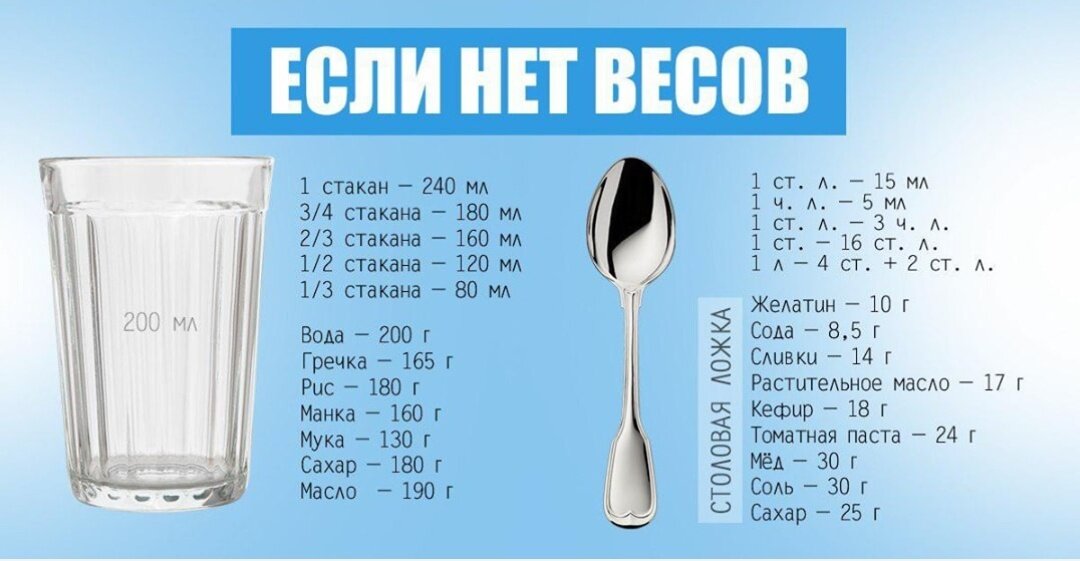 В рецептах можно встретить разное количество всевозможной жидкости. Поэтому для экономии вашего времени, мы приводим готовые расчеты мер и веса в ложках и стаканах.