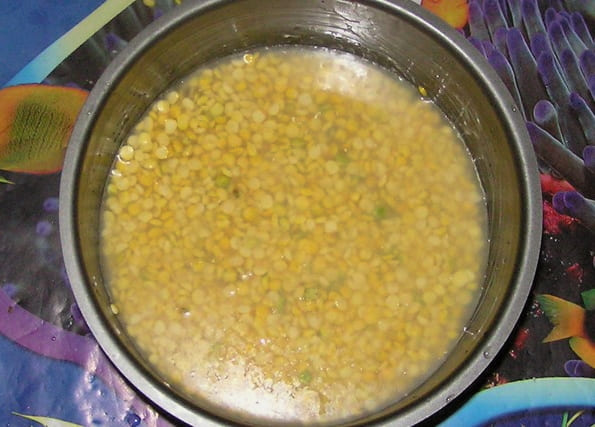 Делается это следующим образом: хорошо промытый горох заливается холодной водой так, чтобы вода его полностью покрывала, и оставляется на несколько часов, в идеале 5-6 часов. Не передержите его, иначе он закиснет!