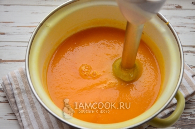 Измельчаем тыкву вместе с жидкостью, в которой она варилась, погружным блендером до полнейшего измельчения всех возможных кусочков. Наш тыквенный сок должен быть совершенен, поэтому измельчаем его как можно дольше до гладкого пюреобразного состояния. Отставляем кастрюлю с тыквенной заготовкой в сторону, даем ей остыть.