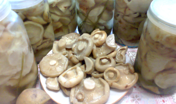 То есть они точно так же вымачиваются, выдерживаются под гнетом, но на этот раз недолго. Буквально через 3 дня белые грузди начинают очень плотно раскладывать по простерилизованным банкам и заливать получившимся рассолом. На поверхность помещают лист смородины или хрена, а сверху наливаются немного растительного масла, после чего банка зарывается полиэтиленовой крышкой.