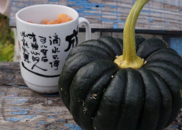 Эта маленькая темно-зеленая тыква «Кабоча», также известная как японская черная тыква, родом из Японии.