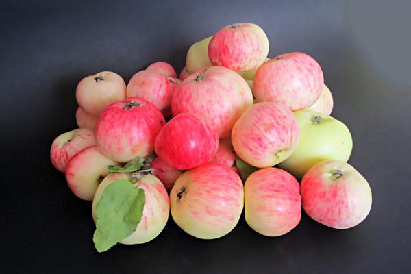 | Форма и окраска | Яблоки округлой формы, приплюснутые (репчатые), слаборебристые. Кожица тонкая и гладкая, блестящая. Основная окраска желтовато-зеленая, при созревании белеет. Покровная – в виде легкого румянца с розовыми полосами, штрихами и крапинами на размытом фоне |