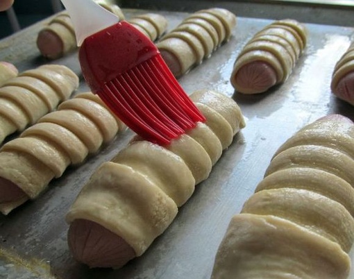 Каждую сосиску обматываем полосками теста таким образом, чтобы каждый следующий виток заступал за предыдущий.