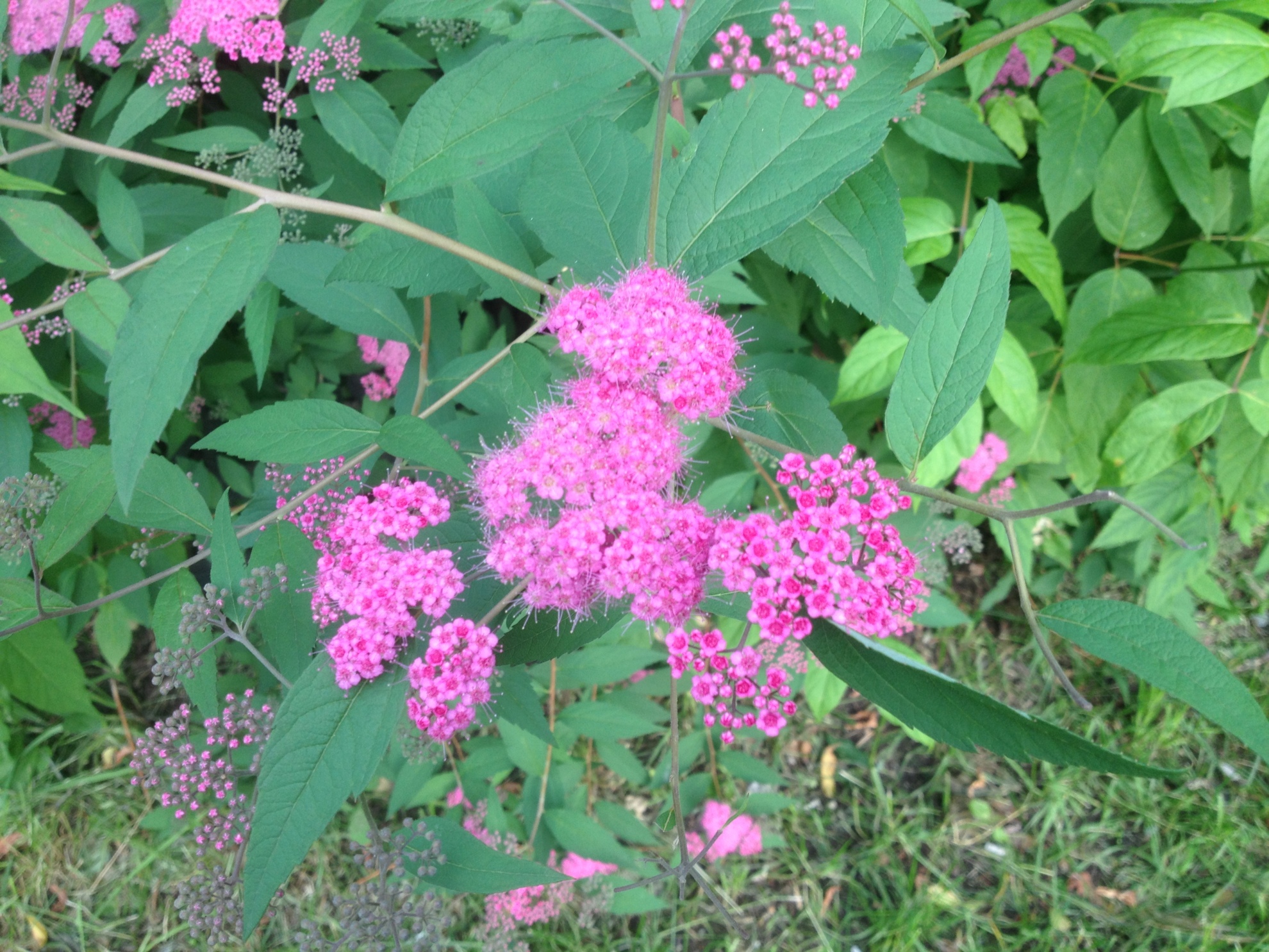 Среди пестрой листвы ее розовые цветы в мелких соцветиях теряются. Цветет спирея «Макрофилла» с конца июля и до конца августа.