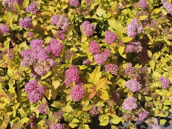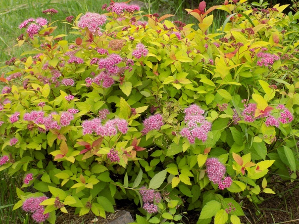 Спирея «Gold Mound»— карликовый, 0,25 м высотой, куст с ярко золотисто-желтой листвой и мелкими соцветиями розовых цветков, появляющиеся в середине июля.