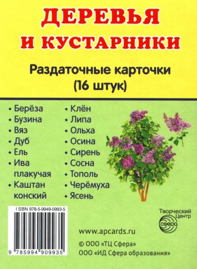 | Определительные таблицы изданы в виделаминированных листов формата А4 (29,7 х 21 см), на обе стороны которых нанесены цветные изображения растений. В данную определительную таблицу включено 28 видовкустарников и кустарничков, произрастающих в средней полосе и возможных для определения в облиственном состоянии (в течение периода вегетации) — по цветкам, листьям и плодам. Включенные в таблицу виды распределены по трем группам: растения с очередным листорасположением, растения с супротивным листорасположением и кустарнички и растения болот. |