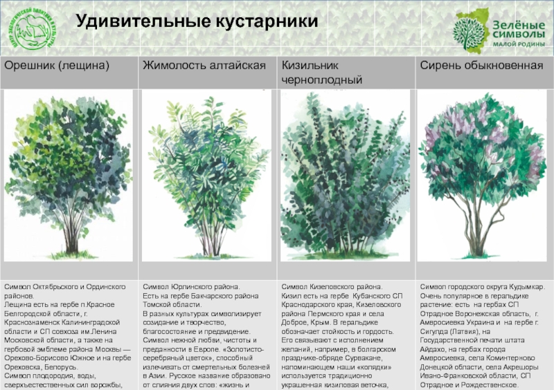 Цветные изображения 28 видов кустарников и кустарничков средней полосы. Виды распределены по трем группам: растения с очередным листорасположением, растения с супротивным листорасположением и кустарнички и растения болот. Для каждого вида показаны: общий вид побега, лист, цветок, соцветие и плод. Подробное описание