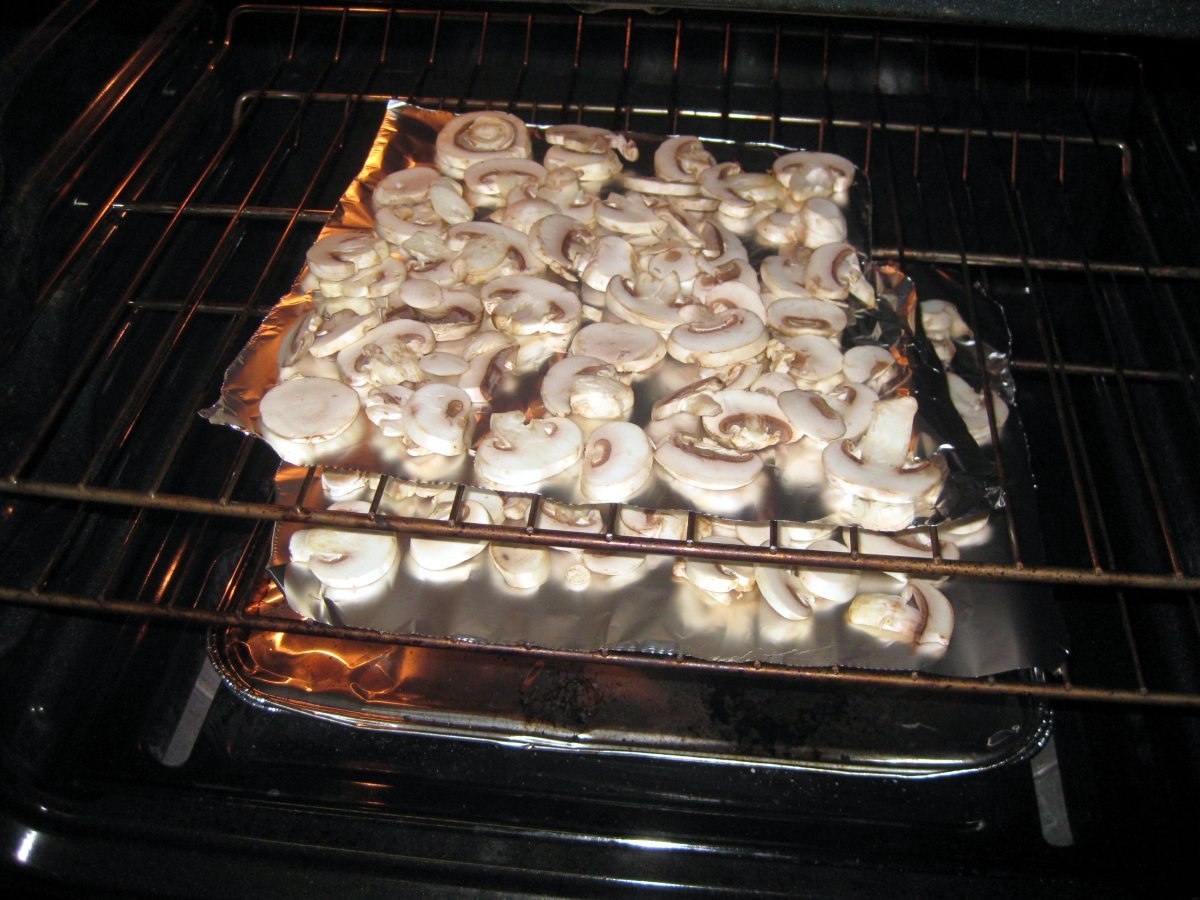 Вам нужна низкая духовка для этого метода; разогрейте духовку до 150 F (65 C). Поместите противень с грибами в духовку и оставьте на один час. Переверните кусочки грибов и верните в духовку еще на час.