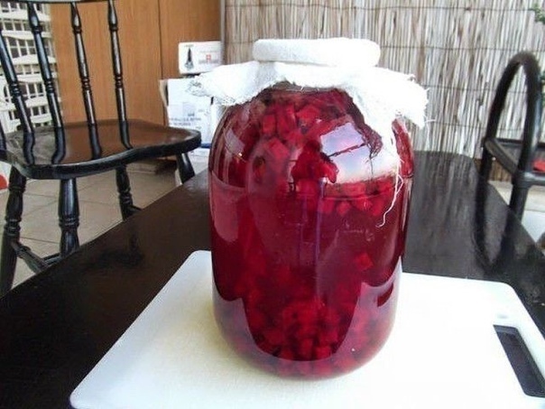 Вам понадобиться несколько корнеплодов свеклы (отдавайте предпочтение самым темным) средних размеров. Свекла чистится от кожуры, моется и режется на части. Затем ею наполняют до половины трёхлитровую банку, доливая ее потом доверху холодной кипяченой водой. Помещаем банку в прохладное место (так, чтобы нашему будущему квасу не было ни холодно, ни жарко), чтобы началось брожение.