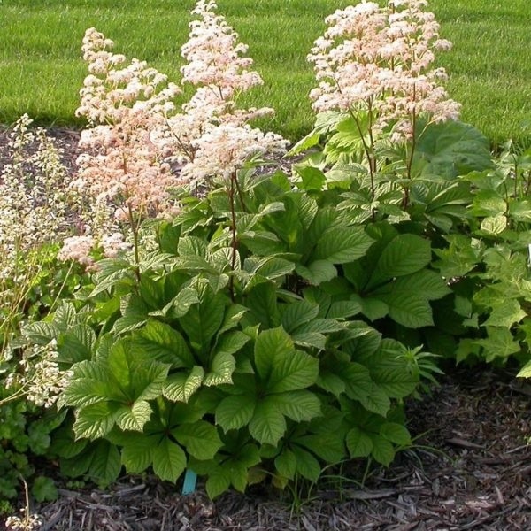 Роджерсия вовсе не привередлива к выбору места произрастания – ей подойдет как глухая тень, так и жаркие солнечные участки. Идеально подойдет разреженная тень – на чрезмерно темных участках цветение не бывает обильным. У этого травянистого растения мелкие розовые, белые, боровые цветки, собранные в соцветия, листья блестящие, напоминают кленовые либо каштановые. Самые популярные: бузинолистная, стополистная, конскокаштанолистная. Размножение производят делением куста либо его корневища, черенкованием. Если посадка сделана в осеннее время, куст быстрее достигает крупных размеров. В период цветения роджерсию необходимо подкармливать, в жару – мульчировать.