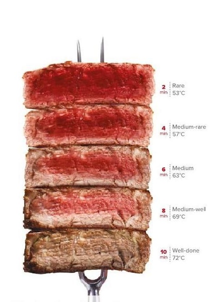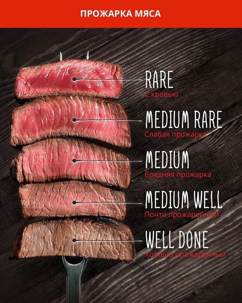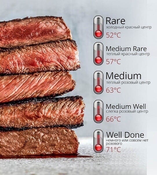 Вопрос степени прожарки сугубо индивидуальный и зависит только от личных предпочтений человека. Кулинары предложили условно разделить степень прожарки на 5 видов: 50°C – Rare, 55°C – Medium Rare, 60°C – Medium, 65°C – Medium Well, 70°C – Well Done (температура внутри стейка).