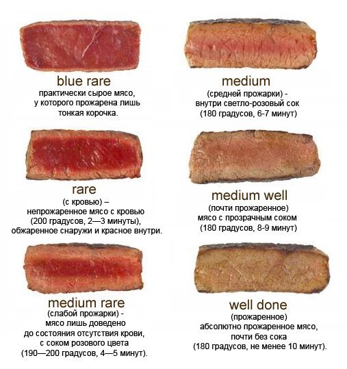 На каждую степень прожарки всегда найдется любитель. Несмотря на то, что истинные ценители деликатесного блюда считают оптимальными все степени Medium, о вкусах не спорят. Одному хочется получить сырой едва подогретый сочный кусок, другому же больше по душе мясо без явных признаков крови и выделений розового сока. Но стоит учесть: чем дольше жарится говядина, чем жестче получится стейк.