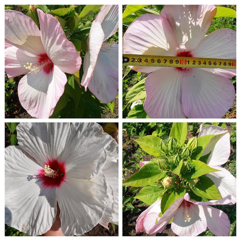 Некоторые из самых крупных цветов происходят от старых резервных гибридов Southern Belle Mix. Это 4-футовое растение имеет 10 ½-дюймовые красные, розовые и белые цветы. Также поражает воображение гибискус «Рубеж веков» с цветками от 8 до 10 дюймов. У него необычные двухцветные цветы с бледно-розовыми цветками на одном. сторона, переходящая в красный цвет по направлению к другой, что указывает на вращающуюся вертушку.