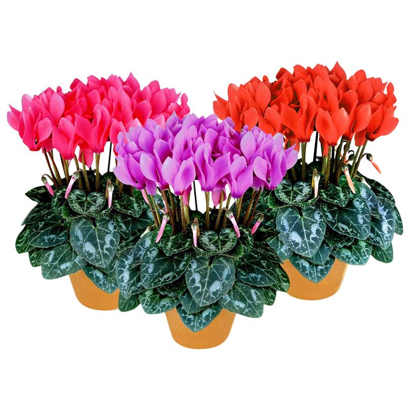 Благодаря новым гибридам растения цикламена стали крупнее, сильнее и эффектнее, чем когда-либо прежде. Над сердцевидными серебристо-зелеными листьями возвышаются вертикальные стебли с красивыми загнутыми назад лепестками оттенков розового, пурпурного, красного или белого.