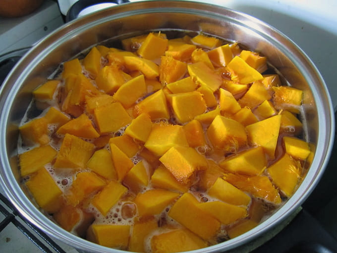 - Нарежьте мякоть тыквы на кусочки среднего размера, залейте водой и поставьте на огонь. Доведите до кипения и варите 10 минут на медленном огне, периодически помешивая.