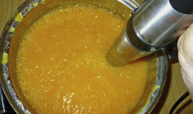 После выделения жидкости из тыквины остается жмых. Чтобы получить сок с мякотью, часть этой отжатой массы добавляют в напиток. После его подвергают термической обработке и закатывают на зиму.
