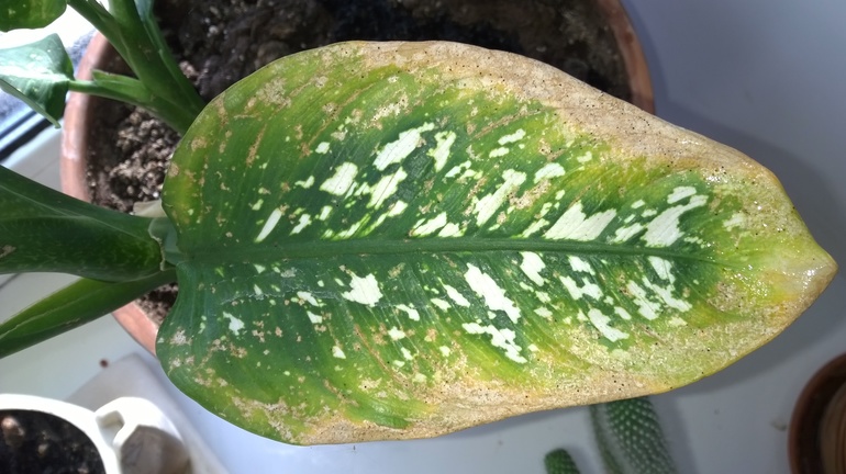 При попадании прямых лучей солнца на листья диффенбахии, образуются желто-коричневые ожоги, которые приводят к пожелтению и засыханию всего листа.