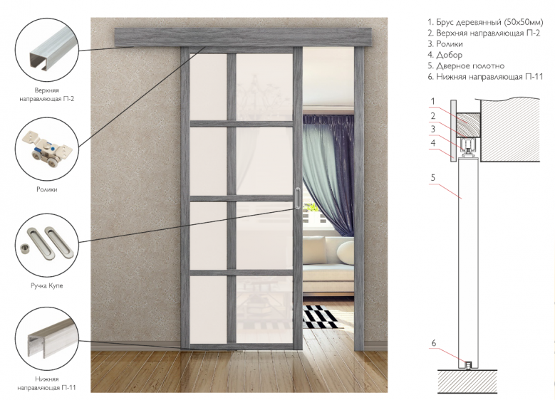 Обычно в стандартную комплектацию раздвижных дверей входят: