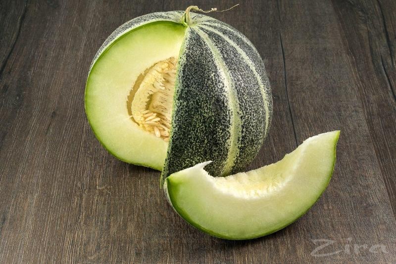 Зеленая шкурка с темными полосками, белая мякоть, слабо выраженный аромат, но удивительно сладкий, сахарный вкус — вот что такое дыня сорта жура канд. Этот вид тоже относится к мягким сортам, она довольно нежная и капризная — в холодильнике нарезанную дыню можно хранить всего один день. В неразрезанном виде она может храниться до четырех дней.