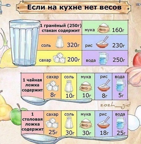 При отсутствии стакана, вес ингредиентов можно вымерять ложками.