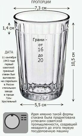 На самом деле в СССР выпускалось огромное количество видов граненых стаканов. Отличались они в том числе количеством граней. Их число могло составлять 10, 12, 14, 16, 17, 18 и 20. Самыми популярными при этом были стаканы на 16 и 20. Стоимость на посуду колебалась от 7 до 14 копеек.