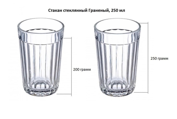 Объём 250 миллилитров (200 — по ободок и ещё 50, если налить доверху) — довольно распространённый вариант в советских общепитах. Да и среди простого населения он тоже пользовался популярностью, поскольку каждая хозяюшка умела с его помощью вычислять необходимое количество кулинарных ингредиентов.