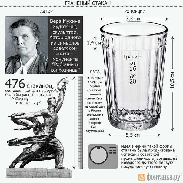К чему столь длинное предисловие? Да к тому, что случайно наткнувшись на статью о появлении нового экспоната в музее, я почему-то вспомнила о дне рождения гранёного стакана. Его-то отмечают 11 сентября, уверяя всех, что именно в этот день 1943 года был выпущен первый экземпляр легендарного достояния советской эпохи, разработанного Верой Мухиной. Явная несостыковка, не так ли? А потому я отправилась на поиски правды о гранёном стакане.