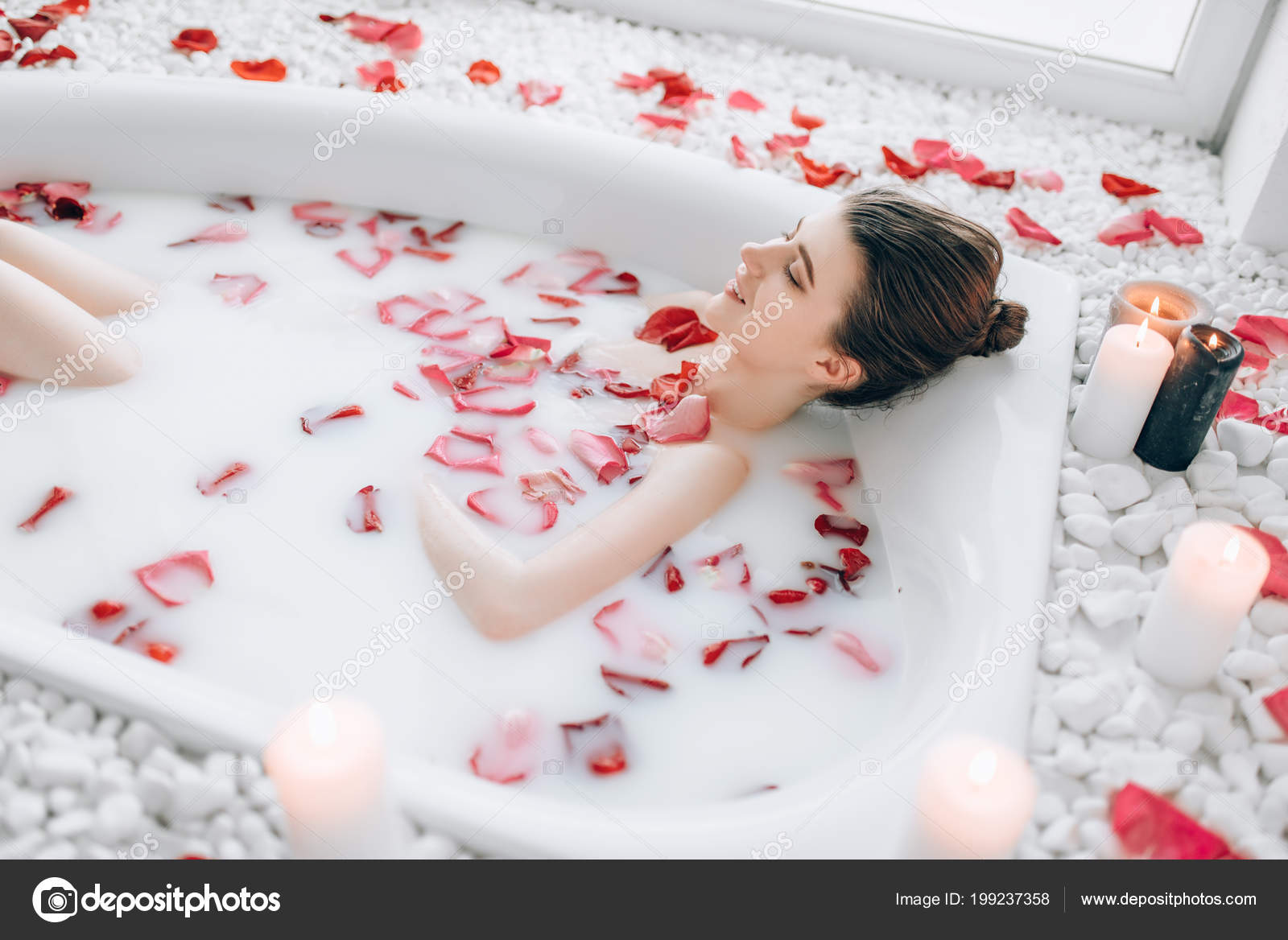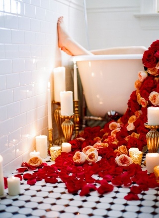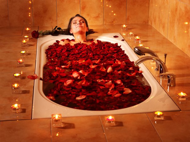 - Для большего эстетического наслаждения оставьте немного лепестков для украшения поверхности воды, зажгите свечи или приглушите свет. Ну а приглашение к купанию любимого мужчины лишь многократно усилит эффективность такой ванны.
