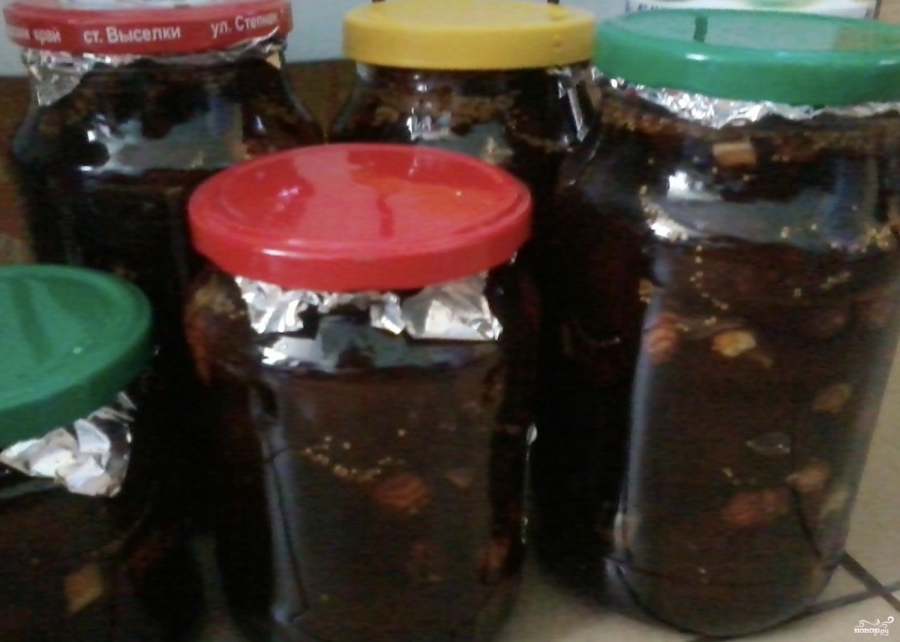 Разложите ковш по стерилизованным банкам так, чтобы они располагались на расстоянии 0,5 см от обода, и протрите обода начисто. Накладываем подготовленные крышки и кольца. Затяните кольца до упора.