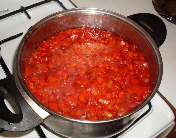 Шаг 6. Емкость с помидорами поместите на средний огонь, закипятите и дайте «отдых» на 30 минут.