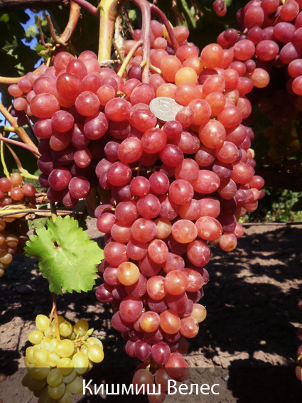 Кишмишный сорт с мускатным вкусом, имеющий нежно-розовый оттенок, — это виноград «Велес». Он был выведен украинскими селекционерами. Сорт отличается высокой урожайностью и отменными вкусовыми качествами. Виноградари со всего мира отдают предпочтение гибриду, у которого отсутствуют косточки. Его плоды имеют нежную сочную мякоть, легко превращающуюся в ароматные десертные вина.